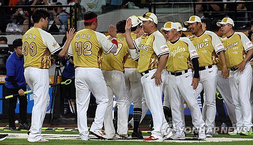 (대전=연합뉴스) 김준범 기자 = 12일 대전 한화생명 볼파크에서 열린 2025 신한 SOL뱅크 KBO 올스타전에서 승리한 나눔 선수들이 기쁨을 나누고 있다. 2025.7.12