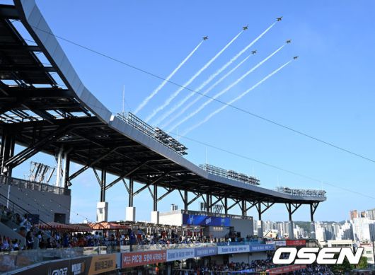 [OSEN=대전, 이대선 기자] 12일 오후 대전 한화생명볼파크에서 2025 신한 SOL뱅크 KBO 올스타전이 열렸다. 13년 만에 대전에서 열리는 KBO 올스타전은 드림 올스타와 나눔올스타 대표로 나선 총 30명의 선수가 치열한 승부를 펼친다. 경기에 앞서 공군 특수비행팀 블랙이글스가 축하 비행을 하고 있다. 2025.07.12 / sunday@osen.co.kr