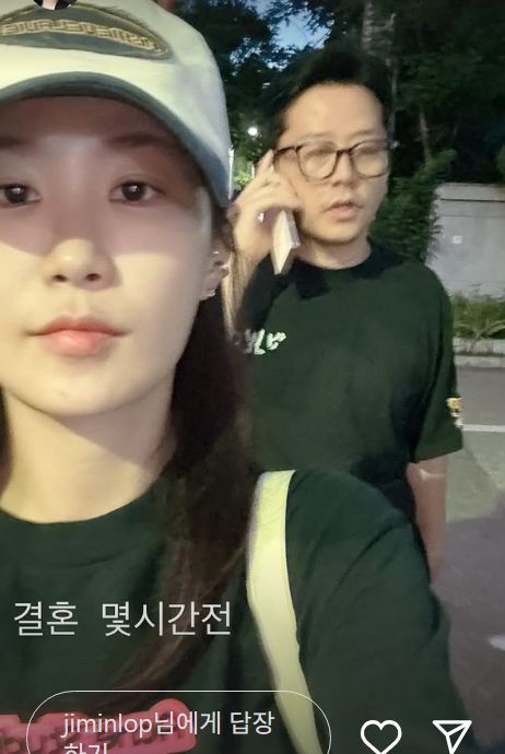 김지민은 12일 자신의 인스타그램 스토리에 "결혼 몇 시간 전"이라는 메시지와 함께 사진 한 장을 올렸다. 사진 속 그는 편안한 캐주얼 차림으로 모자까지 쓰고서 정직한 셀카를 찍고 있다.