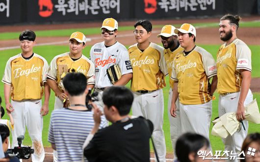 (엑스포츠뉴스 대전, 김한준 기자) 12일 오후 대전한화생명볼파크에서 열린 '2025 신한 SOL Bank KBO 올스타전' 드림 올스타와 나눔 올스타의 경기, 나눔 올스타가 드림 올스타에 8:6 승리를 거뒀다. 한화 선수들이 기념촬영을 갖고 있다.김한준 기자 kowel@xportsnews.com