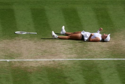 이가 시비옹테크(폴란드)가 12일(현지시각) 영국 런던 올 잉글랜드 클럽에서 열린 윔블던 여자 단식 결승에서 어맨다 아니시모바(미국)를 꺾은 뒤 잔디에 누워 환호하고 있다. 런던/EPA 연합뉴스 |