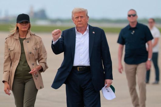 도널드 트럼프(가운데) 미국 대통령이 11일(현지시간) 멜라니아 여사(왼쪽)와 함께 홍수로 심각한 인명 피해가 발생한 텍사스주 샌안토니오를 방문한 길에서 주먹을 들어 보이고 있다. AFP 연합 |