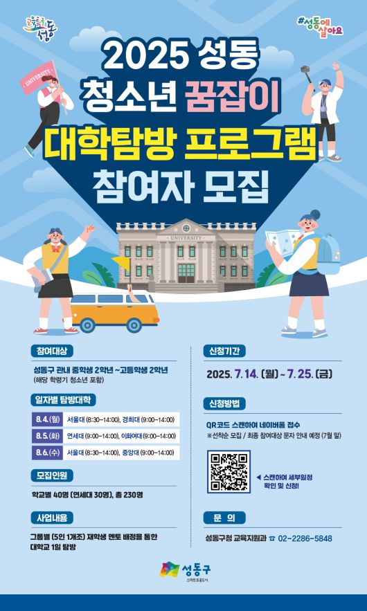 [헤럴드경제=박종일 기자]서울 성동구(구청장 정원오)가 대학 생활을 미리 체험할 수 있는 기회를 제공하는 ‘청소년 꿈잡이 대학탐방 프로그램’을 운영한다고 밝혔다.