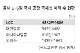 13일 국토교통부 항공 통계에 따르면 올해 1∼6월 국내 공항의 국제선 여객 수(출발·도착 합산)는 총 4582만9686명으로 집계됐다. 이 가운데 국내 LCC 8개사의 국제선 이용객은 1578만1630명(34.4%)이다.
