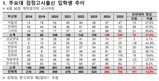 13일 종로학원이 대학알리미 공시자료를 분석한 결과, 이들 대학의 2025학년도 검정고시 출신 입학생이 259명으로 2024학년도(189명)보다 70명(37.0%) 증가했다. 7년 전인 2018학년도 80명에 비해 3.2배 수준으로 증가했다.