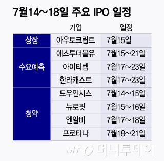 이번주 상장하는 곳은 1곳이다. 오는 15일 상장하는 아우토크립트는 2007년부터 모빌리티 보안 솔루션을 개발·공급해온 국내 유일 글로벌 미래차 소프트웨어 보안 전문기업이다. 전 세계 약 16억대 자동차에 의무적으로 탑재될 차량 사이버보안 솔루션을 공급한다.