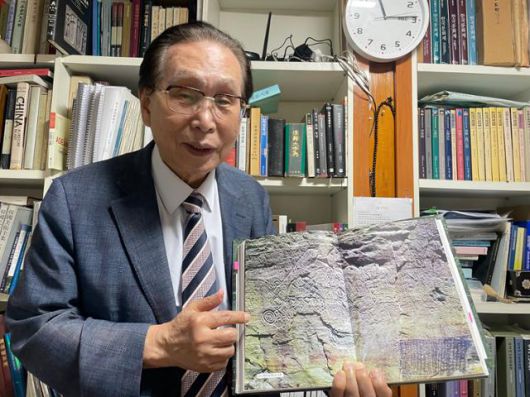 울산 반구천 암각화를 처음 발견한 문명대 한국미술사연구소장이 11일 서울 가회동 연구소에서 자신이 쓴 책을 들고 천전리 암각화를 설명하고 있다. |