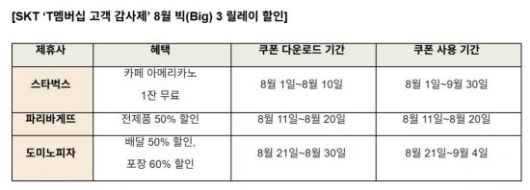 SKT 고객들은 각 제휴사별 1회씩, 한 달에 총 3회 멤버십 제휴 혜택을 이용할 수 있다. 제공하는 무료나 할인쿠폰은 총 수량 제한 없이 모든 고객이 혜택을 누릴 수 있도록 했다.