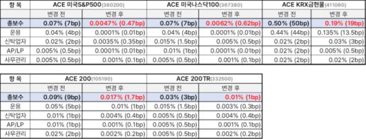 ACE 미국S&P500는 기존 0.07%에서 0.0047%로, ACE 미국나스닥100 ETF는 0.07%에서 0.0062%로 보수를 각각 내린다. 이는 동일 유형 ETF 최저 보수에 맞춘 수준이다.