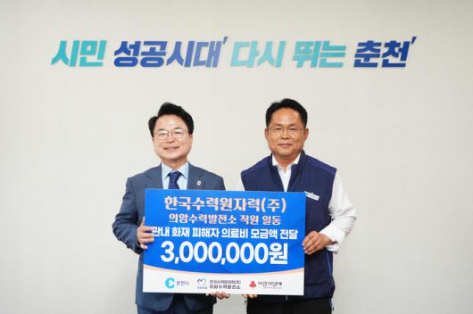 [스포츠서울ㅣ춘천=김기원기자]한국수력원자력 의암수력발전소(소장 최동희)가 10일 춘천시청을 방문해 지역 내 화재 피해자의 치료비로 써달라며 모금액 300만 원을 전달했다.