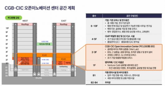 CGB-CIC에 할당되는 면적은 1만㎡(약 3000평)로 지상 2~3층에 집중 배치된다. 기업 맞춤형 공유·단독 오피스를 비롯해 세포·유전자 치료 연구에 특화된 습식 랩(Wet Lab), BSL-2 실험실, 공용 장비실, 초저온 냉동고 및 분석 설비 등을 갖출 예정이다.
