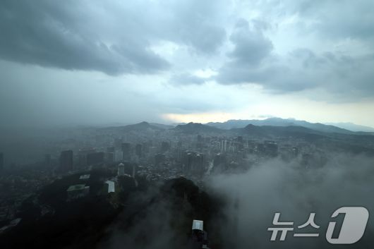 서울타워 전망대에서 바라본 서울 도심 일부 지역에 국지성호우가 내리고 있다. 2025.7.8/뉴스1 ⓒ News1 구윤성 기자 |