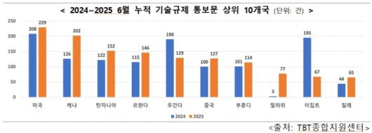 올해 상반기 미국의 기술규제는 229건으로 전년 대비 10.1% 증가했다. 전세계 국가들 중 가장 많은 기술규제다. 미국은 주로 자동차 안전, 기계의 에너지 효율 규제를 강화하고 고위험군의 화학물질 사용을 제한하는 규제를 시행했다.