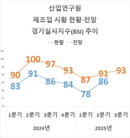 산업연구원은 지난달 1500개 제조기업을 대상으로 지난 2분기 시황 현황을 설문조사한 결과 올 1분기 시황 현황 경기실사지수(BSI)가 86으로 전분기 78 대비 8포인트 올랐다고 13일 밝혔다.
