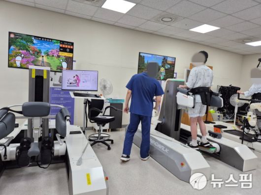 [서울=뉴스핌] 정영희 기자 = 10일 방문한 국립교통재활병원 로봇재활실에서 환자가 보행훈련을 진행하고 있다. 2025.07.11 chulsoofriend@newspim.com |