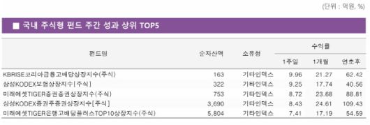 13일 펀드평가사 KG제로인에 따르면 순자산액(클래스 합산) 100억원 이상, 운용 기간 1개월 이상인 국내 주식형 펀드의 최근 일주일(7월 4~11일) 수익률을 분석한 결과 한 주간 가장 높은 수익률을 기록한 ETF는 KB자산운용의 ‘RISE 코리아 금융 고배당’ ETF로 한 주간 9.96% 상승했다. 이밖에 ‘KODEX 보험’ ETF도 한 주간 9.25% 상승했고, ‘TIGER 증권’, ‘KODEX 증권’ ETF도 같은 기간 8.72%, 8.43% 상승하며 주간 수익률 상위권에 이름을 올렸다.