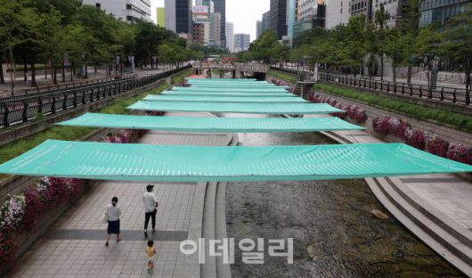 [이데일리 방인권 기자] 폭염이 계속되고 있는 13일 서울 청계천에 설치된 그늘막 아래에서 시민과 관광객들이 휴식하고 있다. 서울시설공단은 청계천 모전교∼광통교 약 50m 구간에 대형 디자인 그늘막을 설치해 한낮 뜨거운 햇볕 속에 시민들에게 쾌적한 쉼터를 제공한다.