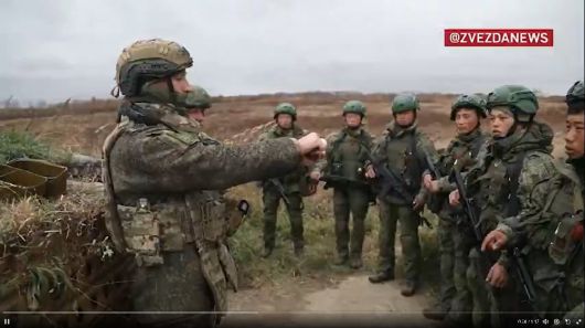 4월 28일 러시아 언론인 블라디미르 솔로비요프와 관영 타스통신 등이 공개한 러시아 쿠르스크 지역 파병 북한군의 훈련 영상. 러시아 군인이 훈련에 참여한 북한 군인들에게 수류탄 투척 시범을 보이고 있다. 솔로비요프 텔레그램 캡처 |
