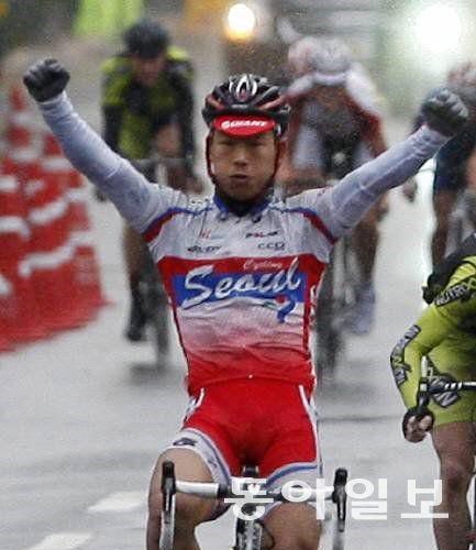 조호성이 2009년 사상 처음으로 서울 도심에서 열린 2009 투르 드 서울 국제사이클대회에서 두 팔을 벌리고 가장 먼저 골인하고 있다. 동아일보 DB |