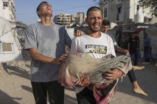 12일 한 팔레스타인인이 이스라엘군의 공습으로 숨진 어린이의 시신을 옮기고 있다. AP연합뉴스 |