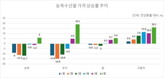 6월 농산물 중 오이의 가격은 전년 동월 대비 19.1% 오르고, 부추 상추의 가격은 각각 9.7%, 6% 올랐다.
