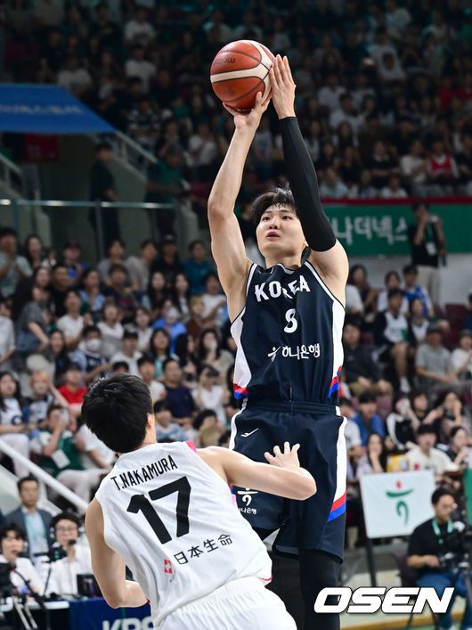 [OSEN=안양, 김성락 기자] 13일 오후 안양 정관장아레나에서 ‘하나은행 2025 남자농구 국가대표 평가전’ 대한민국과 일본의 두 번째 평가전이 열렸다. 대한민국은 지난 11일 열린 일본과의 첫 번째 평가전에서 91-77로 승리를 거뒀다. 1쿼터 대한민국 안영준이 슛을 시도하고 있다. 2025.07.13 / ksl0919@osen.co.kr