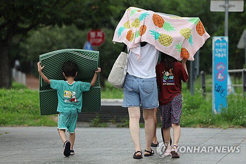 (서울=연합뉴스) 임화영 기자 = 비가 내리며 폭염주의보가 해제된 13일 서울 여의도물빛광장에서 물놀이를 즐기던 시민들이 비를 피해 이동하고 있다. 2025.7.13