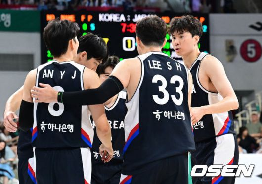 [OSEN=안양, 김성락 기자] 13일 오후 안양 정관장아레나에서 ‘하나은행 2025 남자농구 국가대표 평가전’ 대한민국과 일본의 두 번째 평가전이 열렸다. 대한민국은 지난 11일 열린 일본과의 첫 번째 평가전에서 91-77로 승리를 거뒀다. 1쿼터 대한민국 선수들이 이야기를 나누고 있다. 2025.07.13 / ksl0919@osen.co.kr
