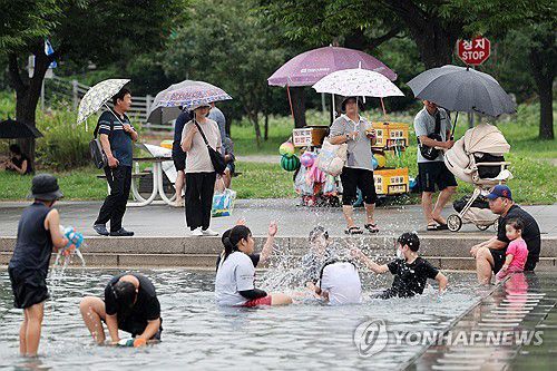 (서울=연합뉴스) 임화영 기자 = 비가 내리며 폭염주의보가 해제된 13일 서울 여의도물빛광장에서 물놀이하는 아이들 뒤로 어른들이 우산을 쓰고 있다. 2025.7.13