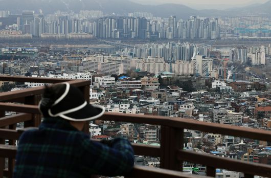 지난 1월 15일 서울 남산을 오르던 시민이 멈춰 도심을 바라보고 있다. /뉴스1 |