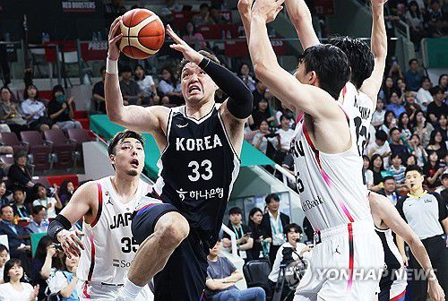(안양=연합뉴스) 홍기원 기자 = 13일 경기도 안양정관장아레나에서 열린 2025 남자농구 국가대표 평가전 한국과 일본의 경기. 한국 이승현이 슛하고 있다. 2025.7.13