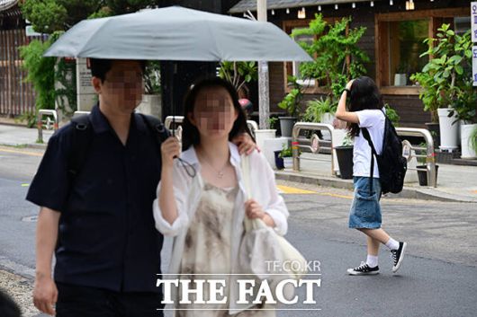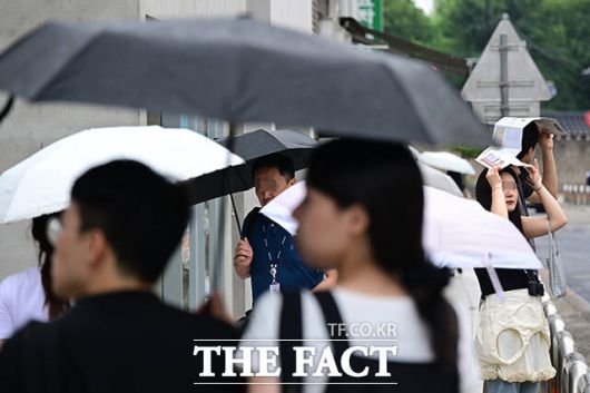 [더팩트ㅣ남윤호 기자] 13일 오후 서울 종로구 창성동 거리에서 한복을 입고 관광을 즐기던 외국인들이 떨어지는 빗방울에 거리를 달리고 있다.