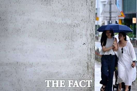 13일 오후 서울 종로구 창성동 거리에서 한복을 입고 관광을 즐기던 외국인들이 떨어지는 빗방울에 거리를 달리고 있다. /남윤호 기자 |