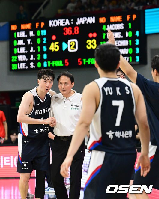 [OSEN=안양, 김성락 기자] 13일 오후 안양 정관장아레나에서 ‘하나은행 2025 남자농구 국가대표 평가전’ 대한민국과 일본의 두 번째 평가전이 열렸다. 대한민국은 지난 11일 열린 일본과의 첫 번째 평가전에서 91-77로 승리를 거뒀다. 2쿼터 작전타임 대한민국 이현중, 안준호 감독이 이야기를 나누고 있다. 2025.07.13 / ksl0919@osen.co.kr