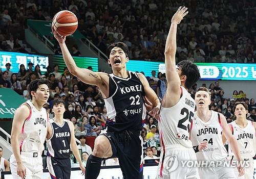(안양=연합뉴스) 홍기원 기자 = 13일 경기도 안양정관장아레나에서 열린 2025 남자농구 국가대표 평가전 한국과 일본의 경기. 한국 여준석이 슛하고 있다. 2025.7.13