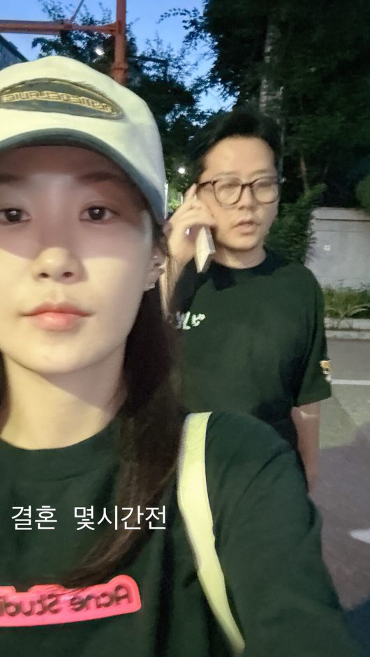 화장기 없는 얼굴의 김지민은 "결혼 몇시간 전"이라며 셀프 카메라 촬영에 나서고 있고, 뒤에는 통화에 한창인 김준호의 모습이 포착됐다.