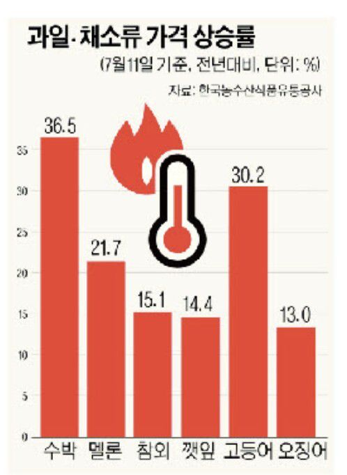 #직장인 A씨는 지난 주말 대형마트에 장을 보러갔다가 과일 판매대의 가격표를 보고 깜짝 놀랐다. 수박 1통값이 2만9000원이나 하고 있었기 때문이다. A씨는 “날씨도 너무 덥고 가족들이 수박을 좋아해서 시원하게 먹으려고 했는데, 3만원이나 가까이 하는 바람에 마음껏 먹을 수 없을 것 같다. 멜론, 복숭아 등 다른 과일들도 비싸다”고 한숨을 내쉬었다. 주부 B씨도 울상을 지어보였다. 수산물 코너 앞에서 몇 번이나 고등어를 들었다놨다 하다가 끝내 빈손으로 돌아섰다. B씨는 “아이들 먹이려고 생선을 쭉 보고 있는데, 고등어가 1마리에 5000원이 넘는다. 장보기가 두렵다”고 호소했다.