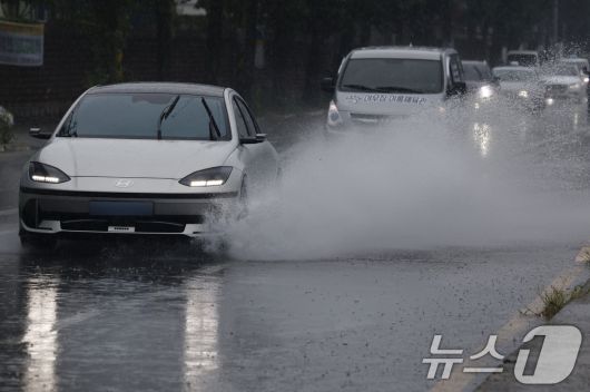 13일 광주전남 일부지역에 호우주의보가 발효된 가운데 남구 월산동 광주천 옆도로에 차들이 물보라를 일으키며 조심스럽게 주행하고 있다. 2025.7.13/뉴스1 ⓒ News1 김태성 기자 |