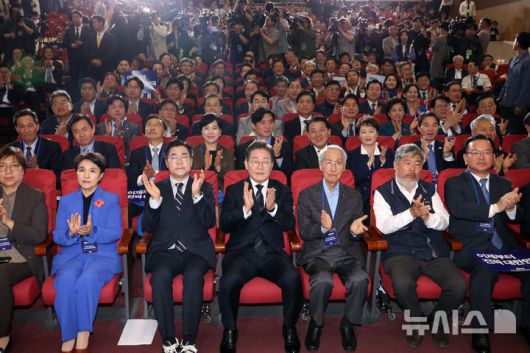 [서울=뉴시스] 조성우 기자 = 이재명(왼쪽 네 번째) 더불어민주당 대선후보와 박찬대, 윤여준 상임총괄선거대책위원장을 비롯한 선대위원장들이 30일 오후 서울 여의도 국회 의원회관에서 열린 더불어민주당 제21대 대통령선거 '진짜 대한민국' 중앙선거대책위원회 출범식에서 박수치고 있다.앞줄 왼쪽부터 정은경, 강금실 총괄선거대책위원장, 박찬대(당대표 직무대행 겸 원내대표) 상임총괄선거대책위원장, 이재명 대선 후보, 윤여준 상임총괄선거대책위원장, 김동명, 김부겸, 총괄선거대책위원장. 2025.04.30. xconfind@newsis.com |