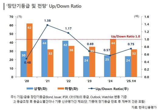 앞서 2024년에는 한해 동안 한신평의 장·단기 신용등급 및 전망 변동배율이 0.57배(상향 25개/하향 44곳)였다. 한신평은 “2021~2022년에 기업실적 개선 및 자본확충에 힘입어 이 배율이 1배를 소폭 웃돌았다가 2023~2024년에는 석유화학·건설·2금융권의 실적 저하 및 내수부진으로 1배를 큰 폭 하회했었다”며 “올해 상반기에도 취약업종 중심으로 신용등급 하향 우위 기조가 지속되긴 했으나 하향 폭은 다소 완화됐다”고 평가했다.