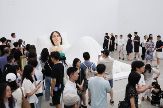 미술관은 지난 10일 “개막 90일 만의 성과로 하루 평균 5590명의 국내외 관람객 발길이 이어지고 있다”고 밝혔다. 이 속도로 추정할 때 ‘론 뮤익’ 전시는 개관 94일 간 약 52만명의 관람객을 모은 셈이 된다. 이날 줄을 선 이들 중엔 친구·애인·가족과 함께 온 국내 관람객이 다수였지만, 외국인 관람객도 눈에 띄었다.