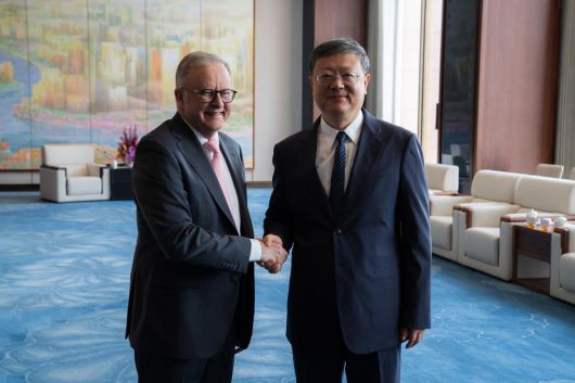 앤서니 앨버니지 호주 총리(왼쪽)는 13일(현지시간) 엑스에 “상하이에서 따뜻하게 맞아준 천지닝 상하이 당서기에게 감사한다”며 천 서기와 함께 찍은 사진을 올렸다. 엑스 |