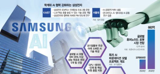 삼성전자(005930)가 서울대, 한국과학기술원(KAIST) 등 국내 선도 대학과 인공지능(AI) 분야 협업을 강화하고 있는 것으로 확인됐다. 이재명 정부의 소버린 인공지능(AI) 역점 정책인 ‘독자 AI 파운데이션 모델 프로젝트’에 참여하기 위한 정예팀 구성에 속도를 내는 것이 아니냐는 게 학계의 관측이다. 로봇을 미래 성장동력으로 낙점한 이후 국내 우수 연구진과의 협업을 통해 필수 인재를 선점해 휴머노이드 로봇 핵심 기술인 피지컬 AI 개발에 속도를 내기 위한 행보라는 분석도 나온다. 정보기술(IT) 업계에 이어 삼성전자가 한국을 대표하는 제조 AI 상용화에 팔을 걷어붙이면서 소버린 AI 구현에 대한 기대감이 커지고 있다.