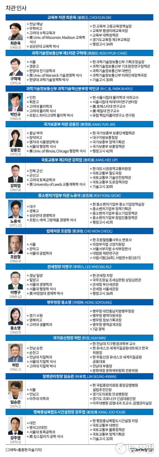질병관리청장에는 임승관 현 국립중앙의료원 중앙감염병원 설립추진단장이 발탁됐다. 강 대변인은 "감염내과 전문의로서 오랜 기간 전문성을 쌓았고 코로나19의 현장 대응을 이끌었던 경험도 있다"며 "국민의 생명과 안전을 보호하기 위한 정부의 노력을 뒷받침할 적임자로 기대된다"고 했다.