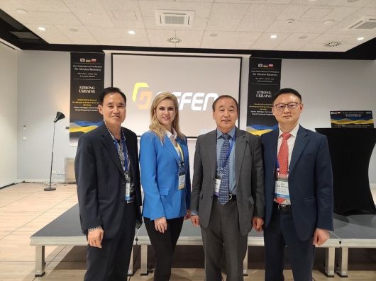 2023년 5월 폴란드에서 개최된 ‘우크라이나 재건 포럼’에서 참석자들이 기념 촬영을 하고 있다. 왼쪽부터 이응근 삼부토건 대표, 엘샤베타 샤브추크 우크라이나 비니치아주 의회 의장, 이양구 전 우크라이나 대사, 구세현 전 웰바이오텍 대표. 웰바이오텍 제공 |
