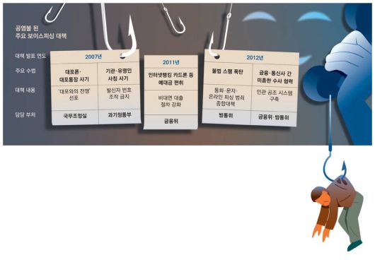 정부의 보이스피싱 첫 대책은 2007년으로 거슬러 올라간다. 당시 국무조정실은 경찰·과기정통부(당시 정보통신부)·국토교통부와 공동으로 대포통장·대포폰 등 불법 명의 물건을 뿌리 뽑겠다며 '대포와의 전쟁'을 선포했다. 하지만 이 대책은 수년간 이행되지 않았고, 그사이 대포폰을 악용한 사기 피해는 폭증했다. 대포폰 대출사기 피해 건수는 2006년 132건에서 2011년 2357건으로 20배 가까이 늘었다.