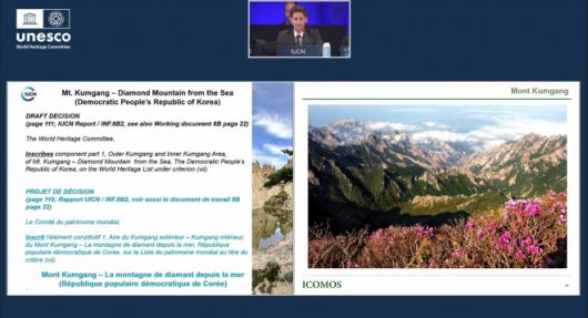 프랑스 파리에서 진행 중인 세계유산위원회에서 북한의 ‘금강산’의 세계유산 등재에 대해 이야기하고 있다. 세계유산위원회 실시간 중계 화면 캡쳐. |