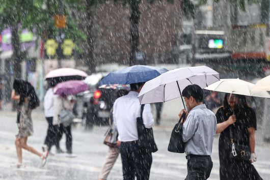 소나기가 내리는 8일 오후 서울 종로구 종각역 인근에서 시민들이 발걸음을 재촉하고 있다. 뉴스1 |