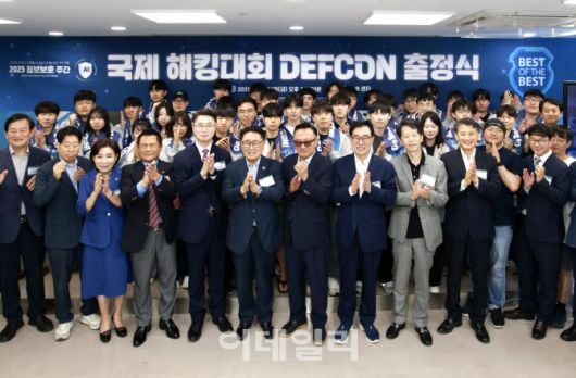 [이데일리 김태형 기자] 유준상 한국정보기술연구원장과 관계자들이 11일 ‘2025년 데프콘 국제해킹방어대회 본선 대회에 출전하는 멘토 및 수료생들과 출정식을 갖고 있다.