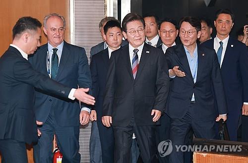 (서울=연합뉴스) 홍해인 기자 = 이재명 대통령이 13일 서울 강남구 코엑스에서 열린 2025 세계정치학회(IPSA) 서울총회 개막식에 입장하고 있다. 2025.7.13 [대통령실통신사진기자단]